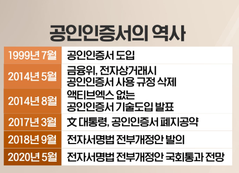 그래서 2014년에 금융위원회의 전자상거래시 공인인증서 사용 규정을 삭제했지만,관공서가 인습에 얽매여 계속 사용을 해오다가 2017년 문대통령의 공인인증서 폐지 공약을 근거로,2018년 9월 정부에서 전자서명법 전부개정안 발의를 했고,오늘 전자서명법 전부개정안이 국회 본회의를 통과했습니다.