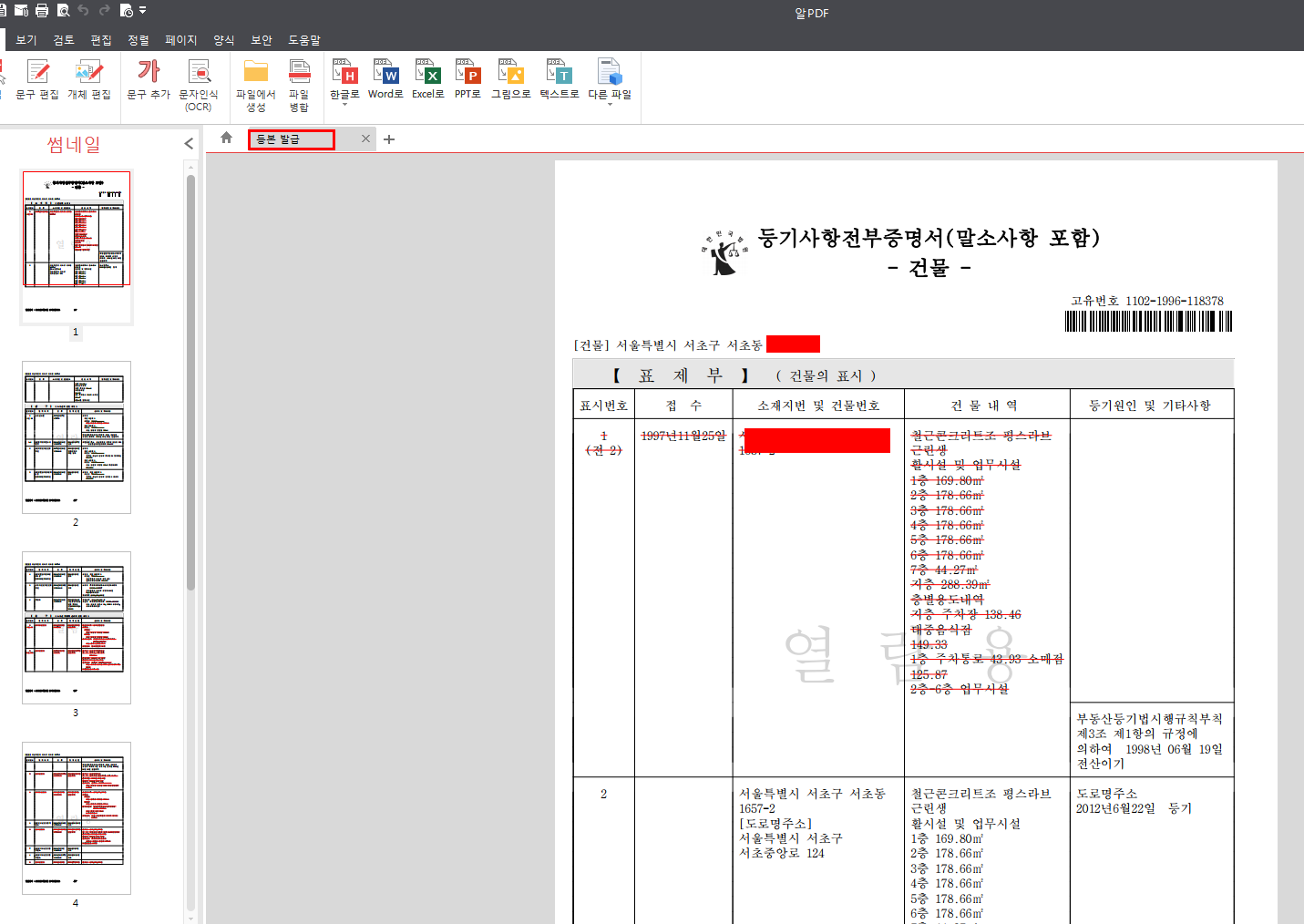 그러면 다시 창이 뜨면서 알PDF로 된 등기부등본 문서가 보입니다. PDF파일로 된 등기부등본 문서 화면이 보이시죠? 이것을 원하는 폴더에 저장하면 됩니다. 간단하죠?