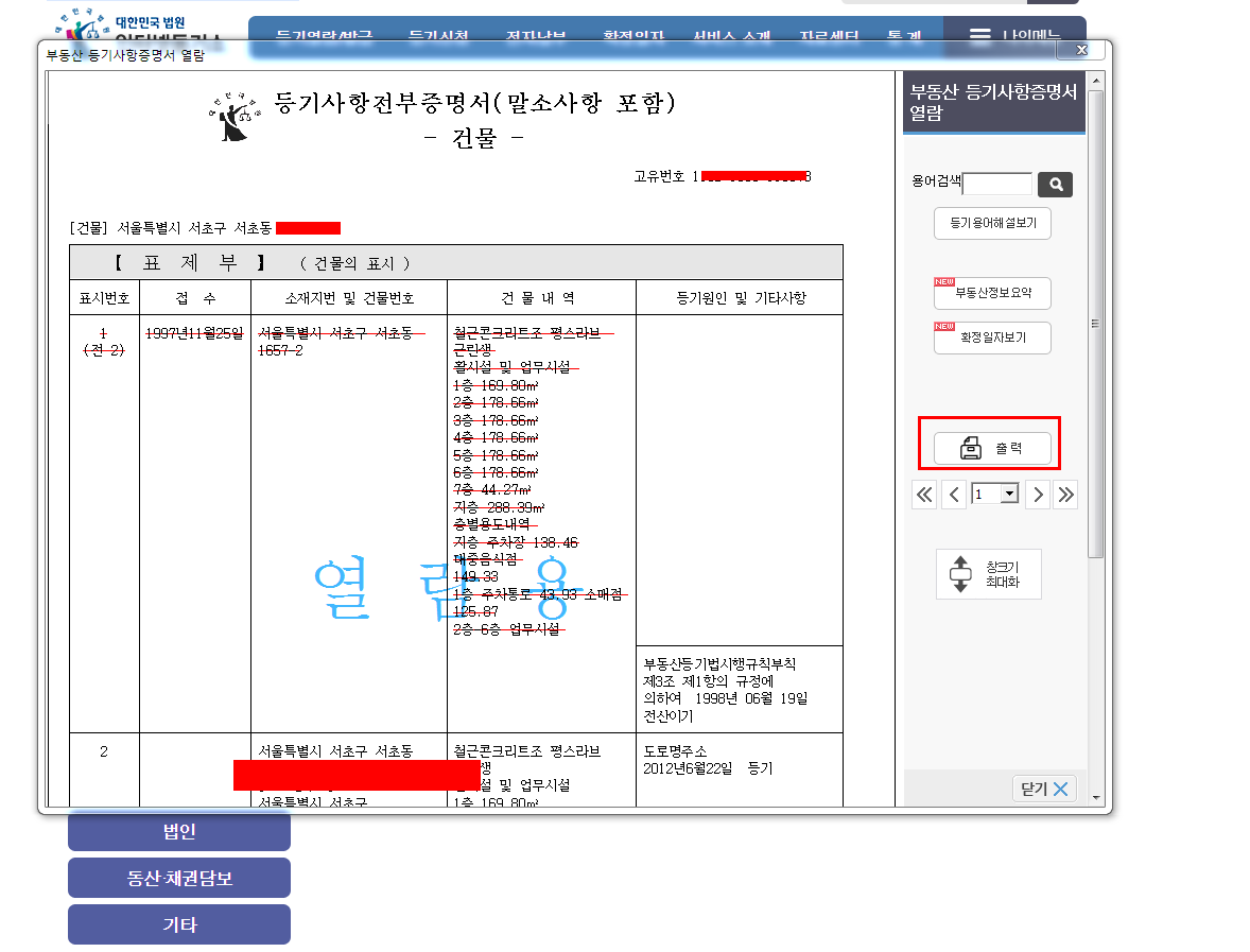 모든게 정상적일때 열람버튼을 클릭하면 드디어,원하던 등기부등본 창이 열립니다.앗..여기서 한가지 팁을 드리자면,"열람 버튼" 바로 밑에 작은 네모칸이 보이는데,"등기사항 요약"입니다.