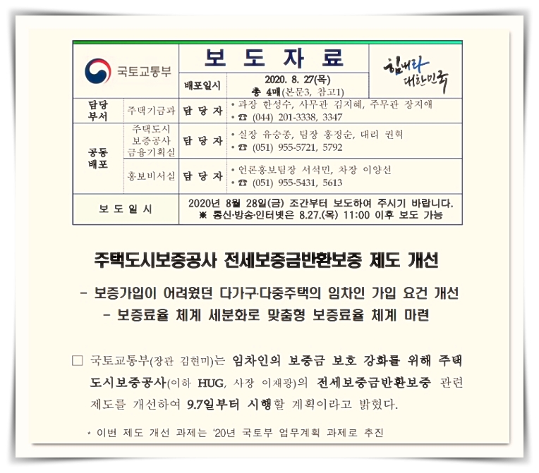 지난 8월말경에 국토부에서 보도된 전세보증금 반환보증 제도 개선에 대한 내용입니다.