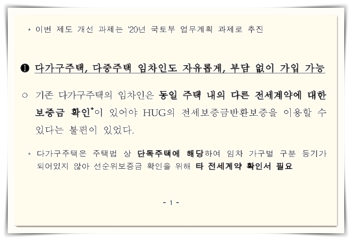 그동안 보증가입이 어려웠던 다수의 세입자가 거주하는 통건물인 다가구,다중주택에 대해서도 세입자가 가입할수 요건을 완화해서 시행한다는 내용입니다.