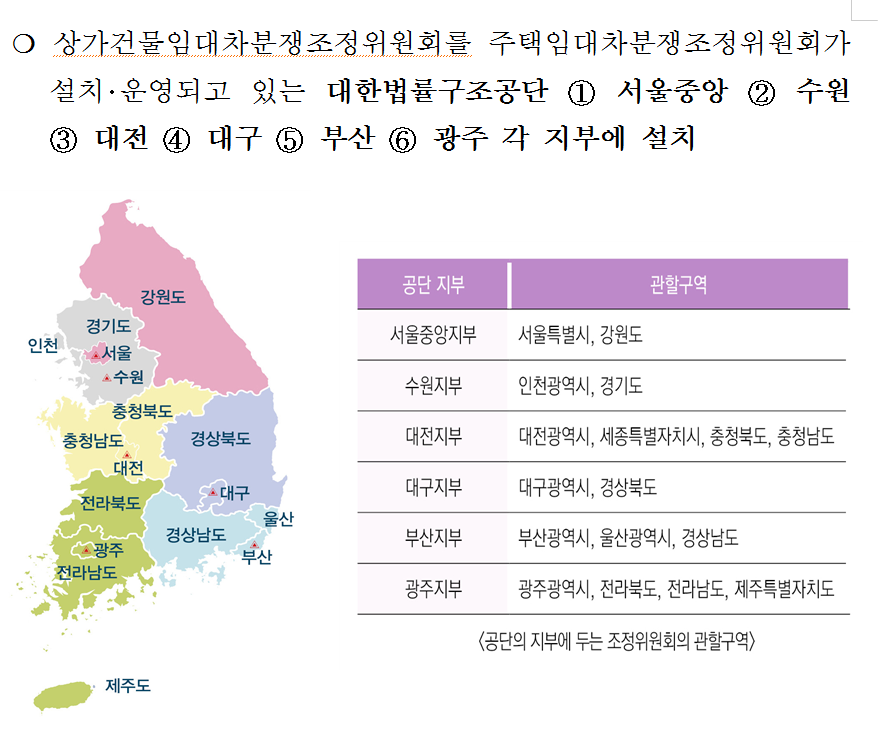 상가임대차 분쟁조정위원회 체계입니다. 아이러닉하게도 거리가 먼 강원도가 서울중앙지부에 같이 있습니다.