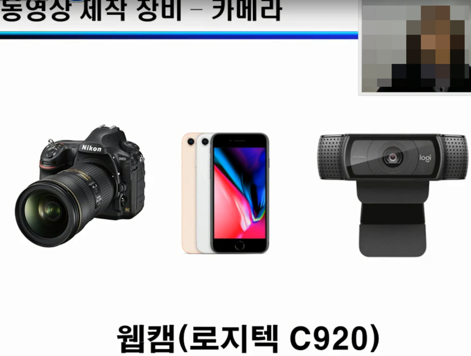 웹캠은 로지텍c920이 가성비가 좋다고 하시네요.가격대는 6~7만원대.카메라는 바로 구매하지 말고,우선 모바일 폰을 이용하라고 하네요.동영상 촬영하다가 필요한게 느껴지면 그때 구매해도 된다고 합니다.