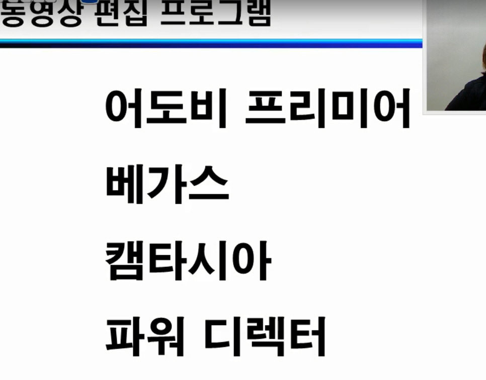 어도비,베가스,캠타시아는 유료 프로그램이며,이중에서 어도비 프로미어를 많이 사용한다고 합니다.파워 디렉터는 무료판이 있다고 합니다.개인적으로 파워디렉터를 사용하고 있습니다....