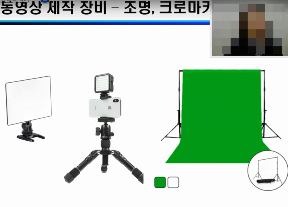 영상을 녹화할때 조명도 중요하다고 합니다.집이나 사무실에서 동영상을 만들때 뒷배경을 깔끔하게 해주는게 필요한데,롤스크롤이나 코로마키천이 있는데,코로마키천을 추천해주시네요.